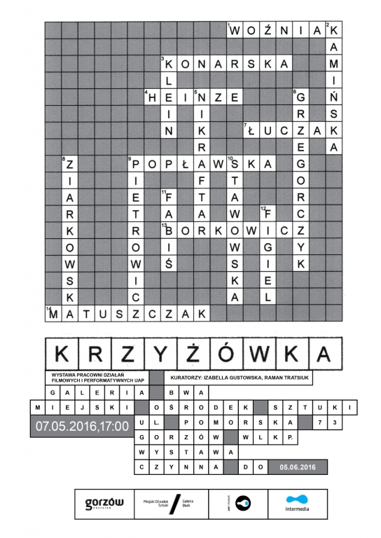 W Pracowni Działań Filmowych i Performatywnych poszukujemy nowej formuły dla działań związanych z obszarem narracji, przestrzenią pozakadrową, działaniami performatywnymi, intermedialnymi i interaktywnymi. Krzyżówkę, którą prezentujemy w Galerii BWA w Gorzowie Wielkopolskim, zaczęliśmy w październiku 2015 od prostego zapisu słowo / obraz, kończymy w maju 2016 – indywidualnymi realizacjami, które wspólnie budują hybrydyczną formę o charakterze multimedialnym. Nasza Krzyżówka ukrywa tajemnice, prowokuje do szukania innych rozwiązań, bo gra z obrazem i słowem, jest otwarta także dla odbiorcy…