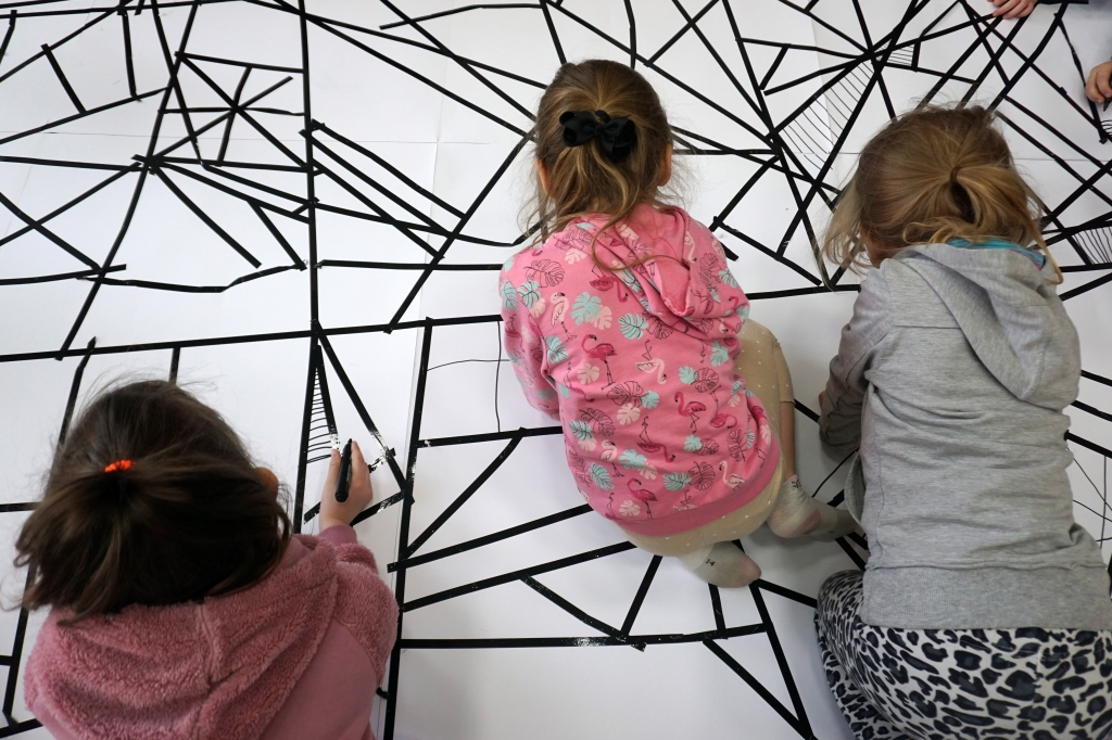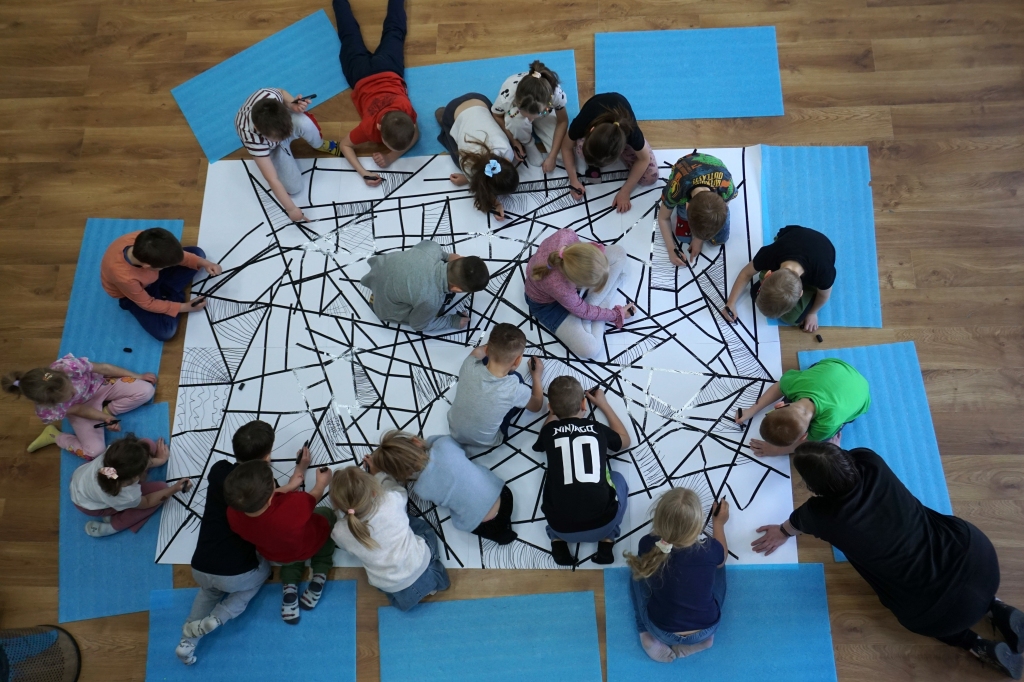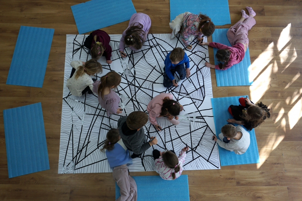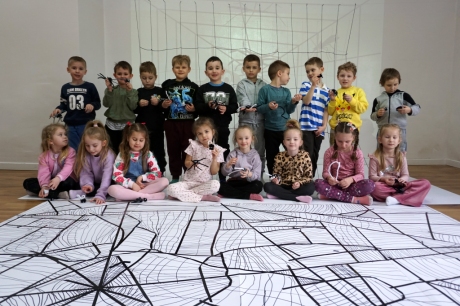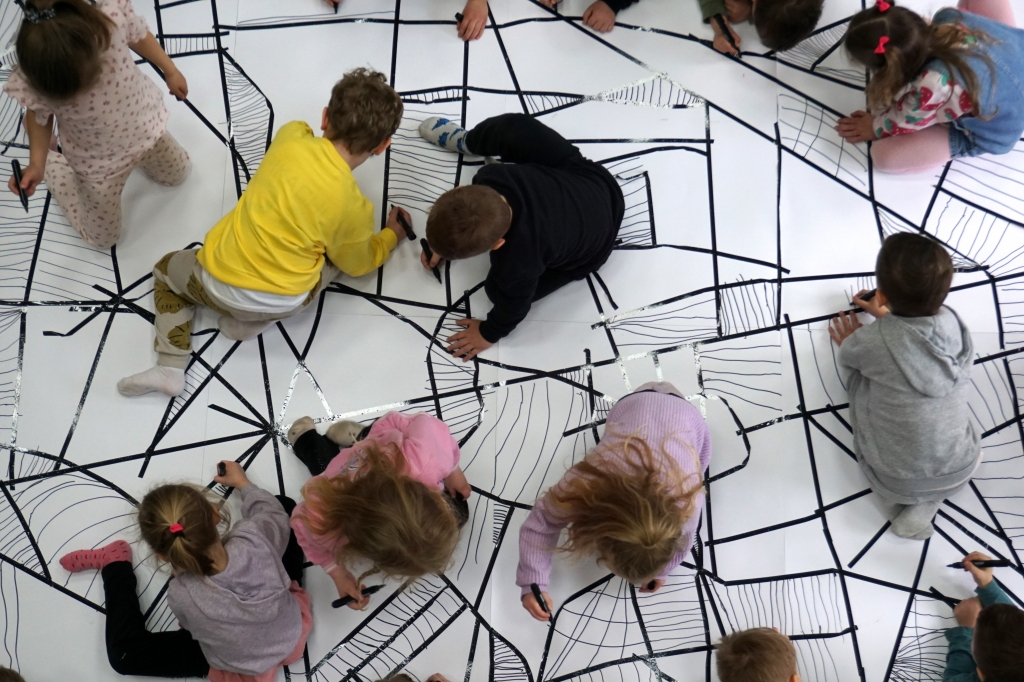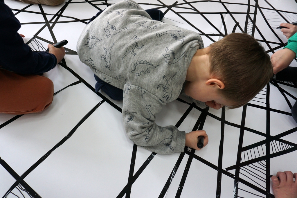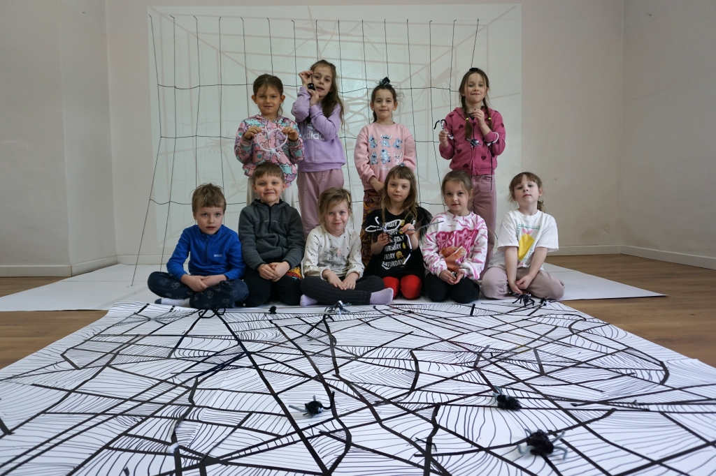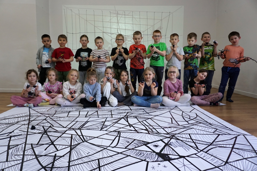 W dniach 9-12.03.2026 odbyły się pierwsze w II cyklu warsztaty SZTUKO(S)TWORY z ciekawskim stworkiem Florkiem. Dzieci wraz z nim szukały linii w przestrzeni lasu. Zobaczyły, że z linii zrobiona jest pajęczyna i elementy owadów: odnóża, czułki. Dzieci na dużej kartce papieru z taśmy klejącej stworzyły dużą pajęczynę. Następnie z drucików kreatywnych i wełny wykonały swoje wymyślone owady/mieszkańcy pajęczyny. W tej edycji SZTUKO(S)TWORY inspirują się fauną, czyli światem zwierząt.