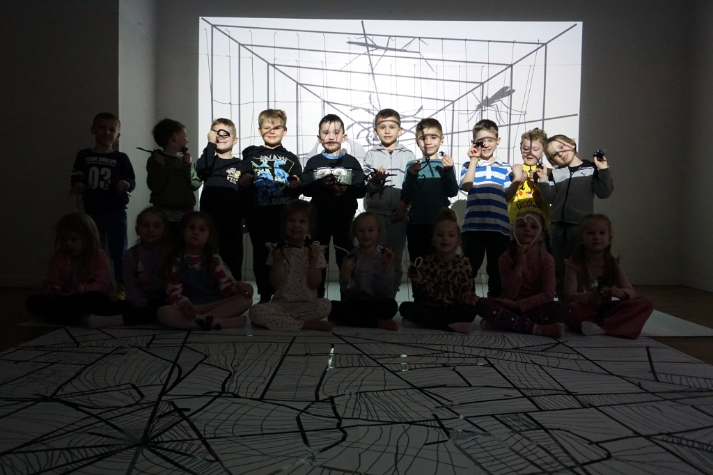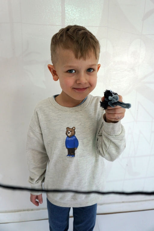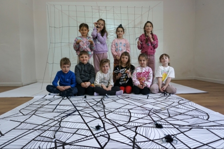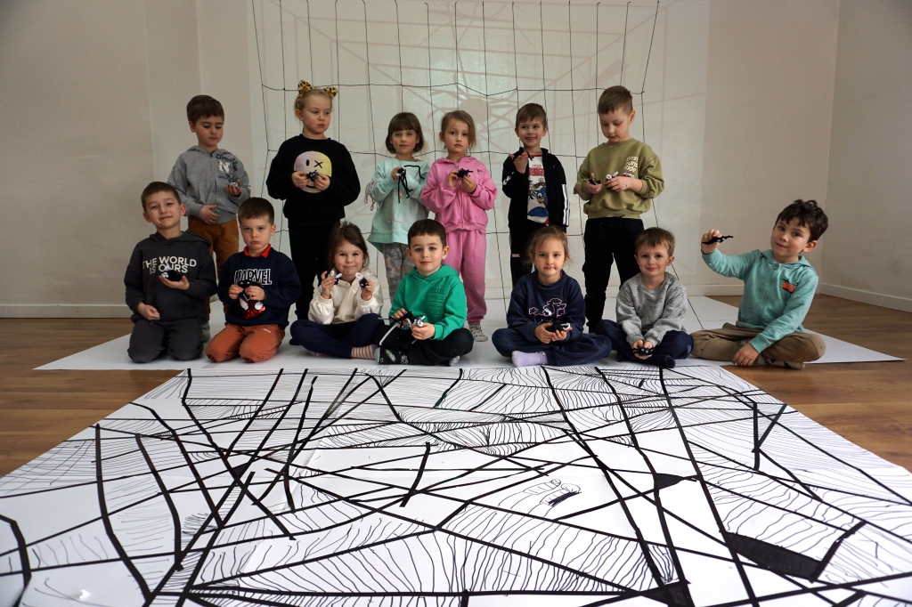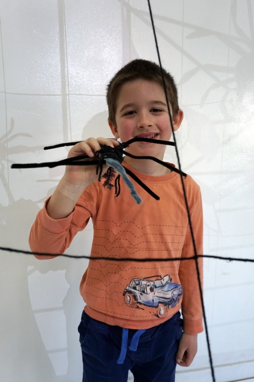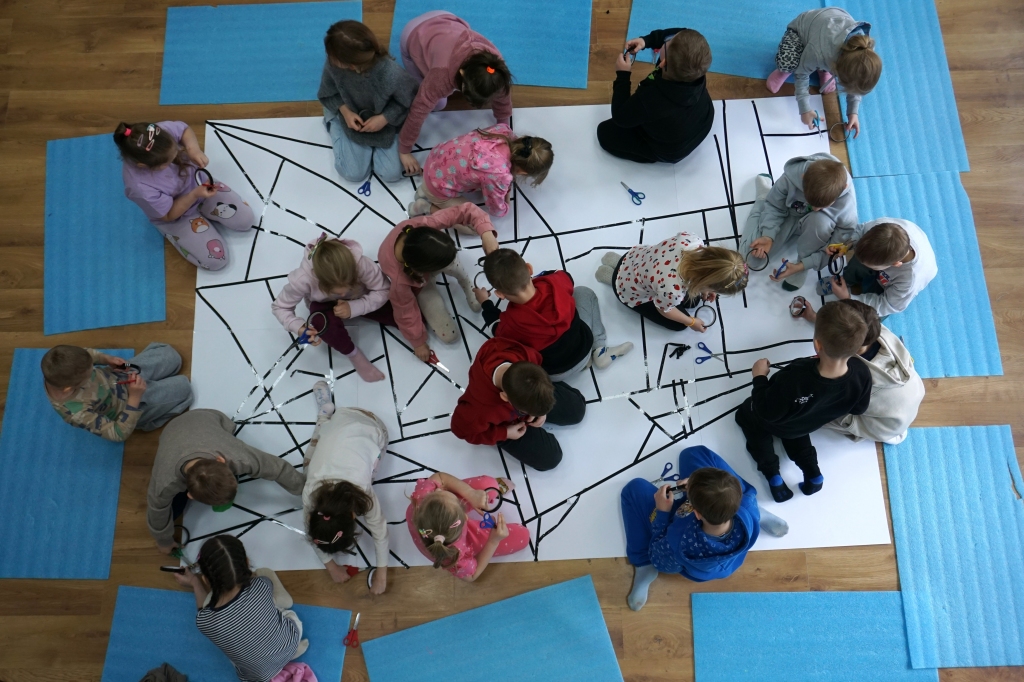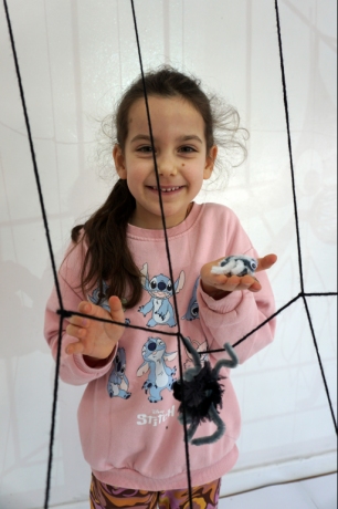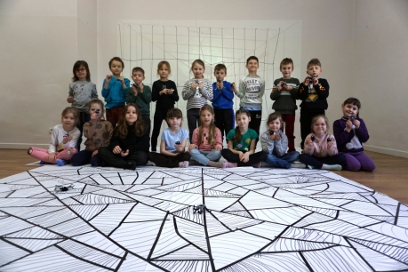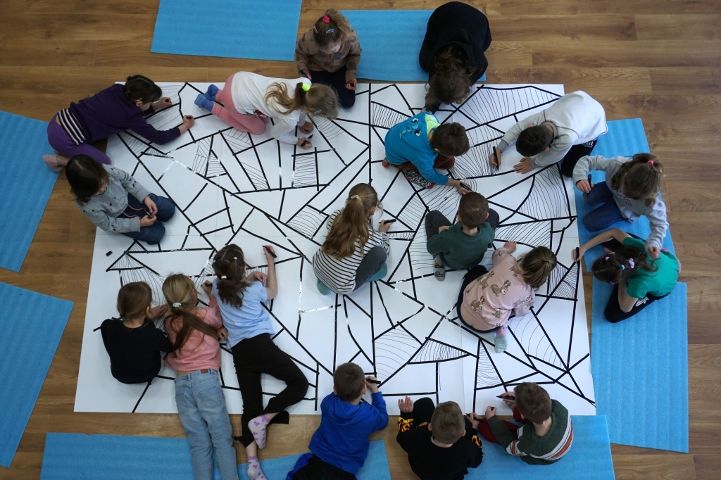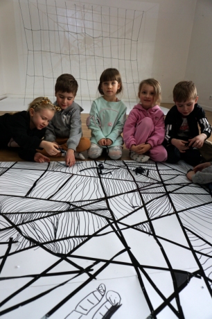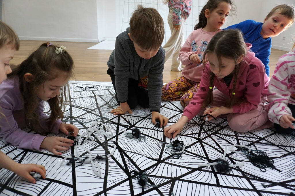 W dniach 9-12.03.2026 odbyły się pierwsze w II cyklu warsztaty SZTUKO(S)TWORY z ciekawskim stworkiem Florkiem. Dzieci wraz z nim szukały linii w przestrzeni lasu. Zobaczyły, że z linii zrobiona jest pajęczyna i elementy owadów: odnóża, czułki. Dzieci na dużej kartce papieru z taśmy klejącej stworzyły dużą pajęczynę. Następnie z drucików kreatywnych i wełny wykonały swoje wymyślone owady/mieszkańcy pajęczyny. W tej edycji SZTUKO(S)TWORY inspirują się fauną, czyli światem zwierząt.