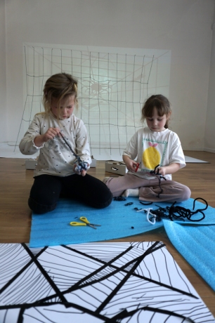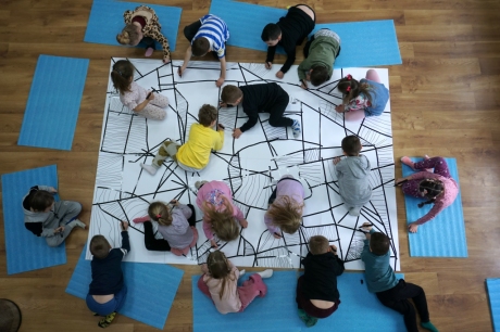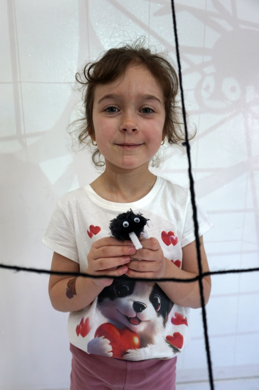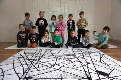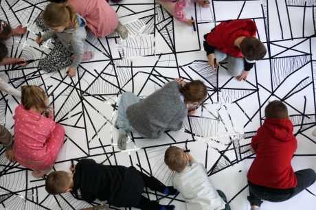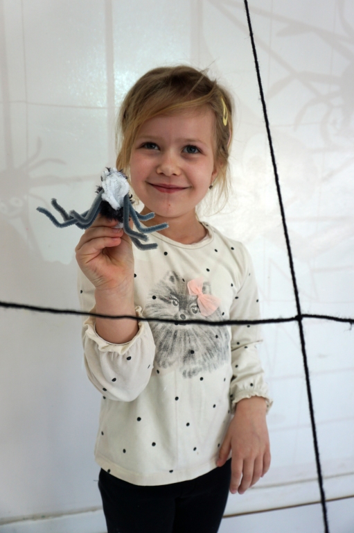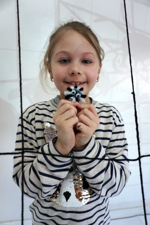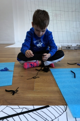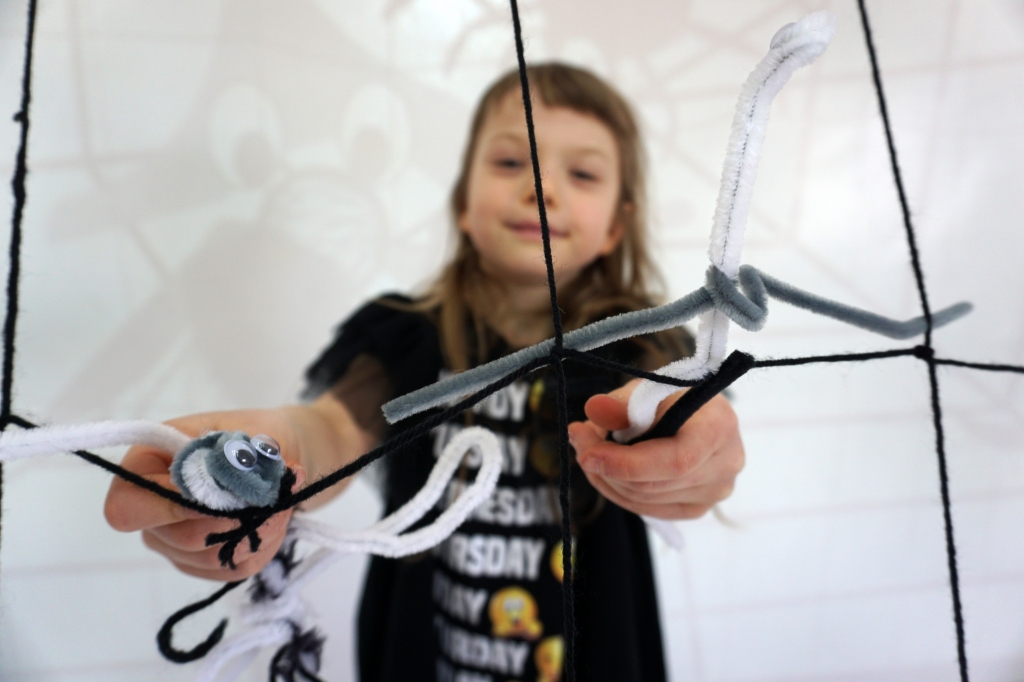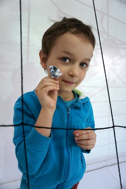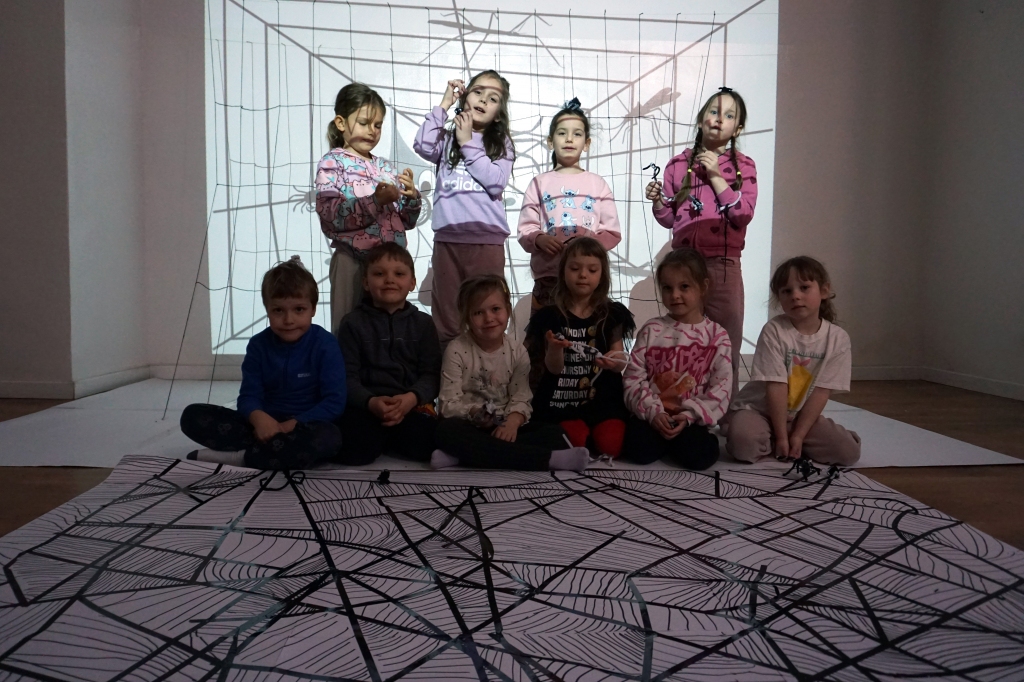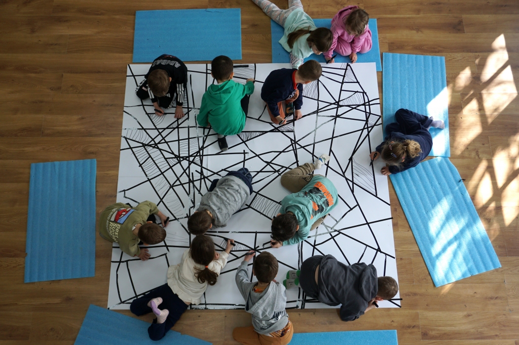 W dniach 9-12.03.2026 odbyły się pierwsze w II cyklu warsztaty SZTUKO(S)TWORY z ciekawskim stworkiem Florkiem. Dzieci wraz z nim szukały linii w przestrzeni lasu. Zobaczyły, że z linii zrobiona jest pajęczyna i elementy owadów: odnóża, czułki. Dzieci na dużej kartce papieru z taśmy klejącej stworzyły dużą pajęczynę. Następnie z drucików kreatywnych i wełny wykonały swoje wymyślone owady/mieszkańcy pajęczyny. W tej edycji SZTUKO(S)TWORY inspirują się fauną, czyli światem zwierząt.