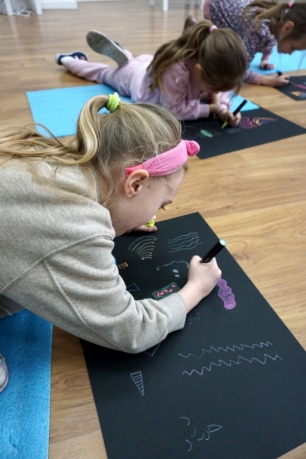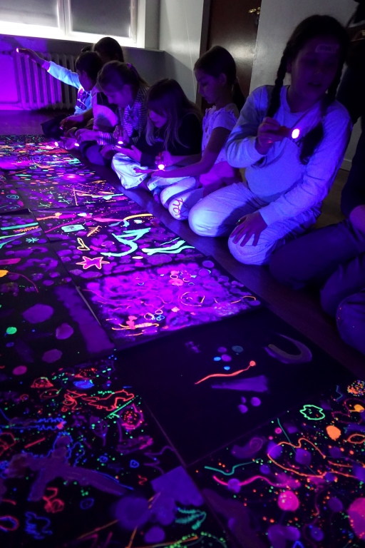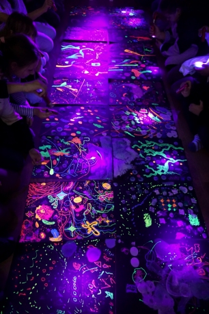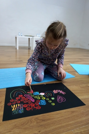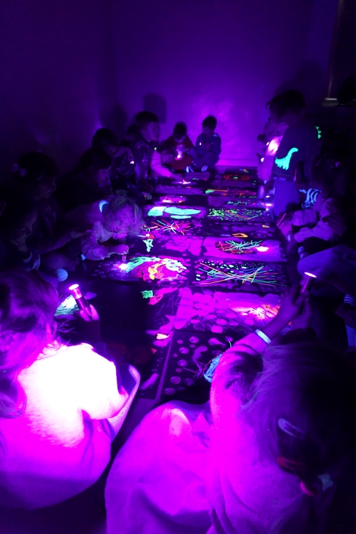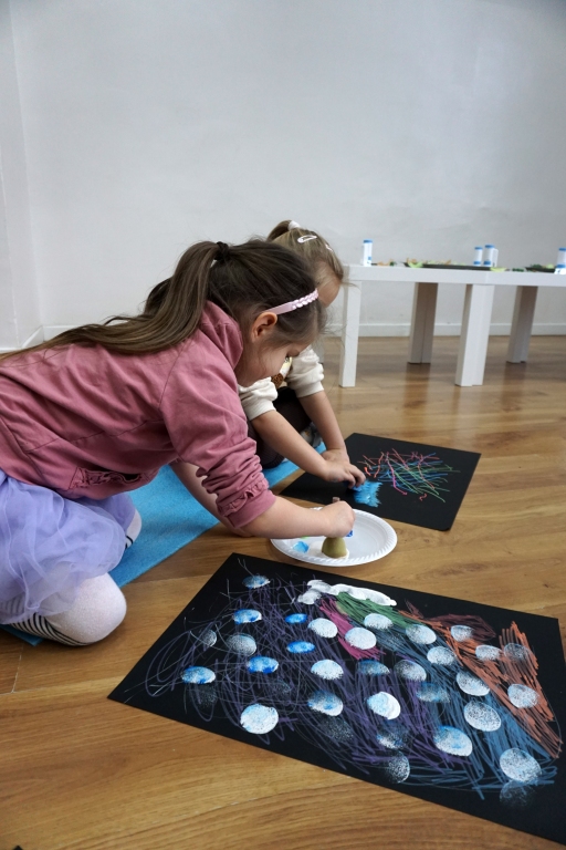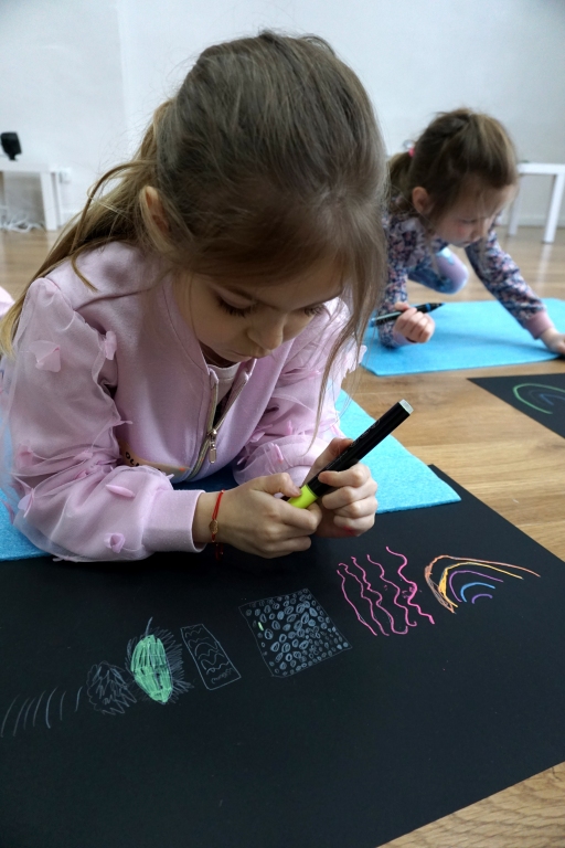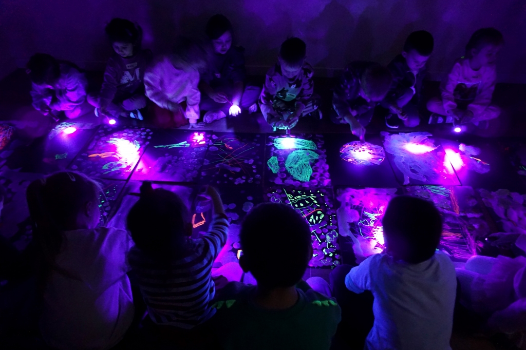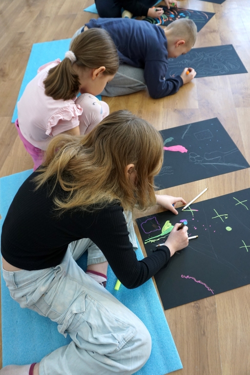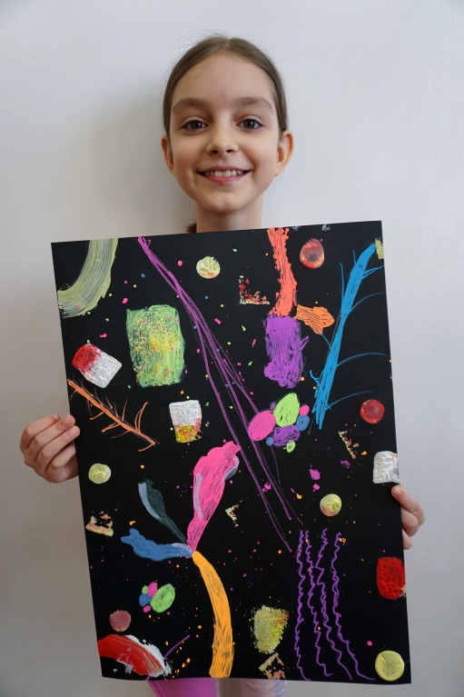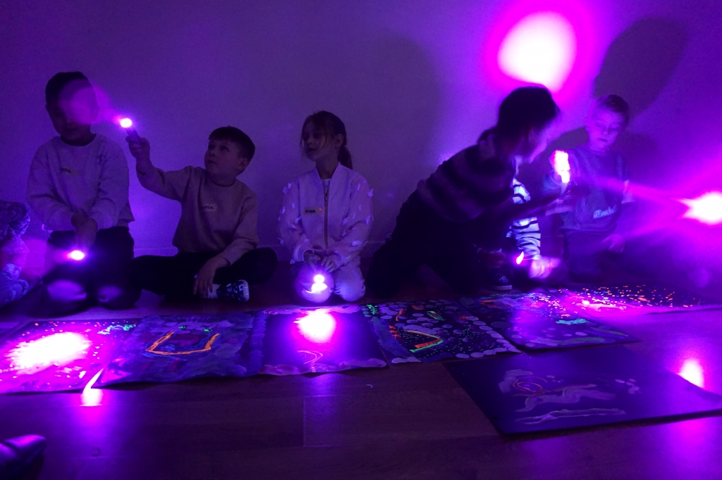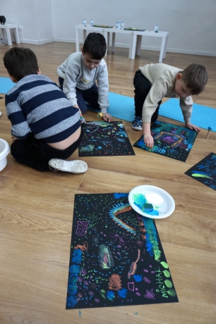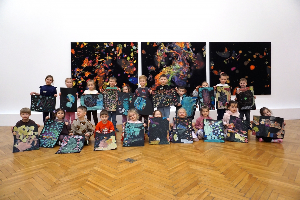 Podczas kolejnych warsztatów dzieci zwiedziły wystawę Anny Kołackiej. W części praktycznej zainspirowały się obrazami artystki i tym co zobaczyły pod mikroskopem, tworząc abstrakcyjne obrazy na czarnym tle z użyciem mazaków fluo i farb.