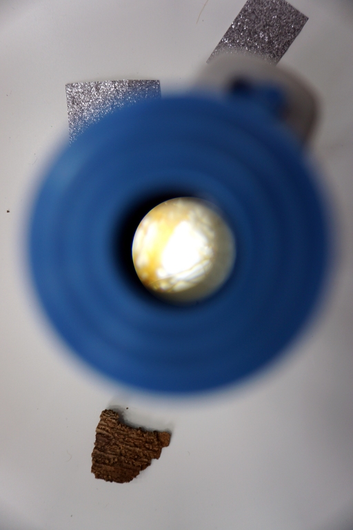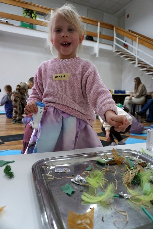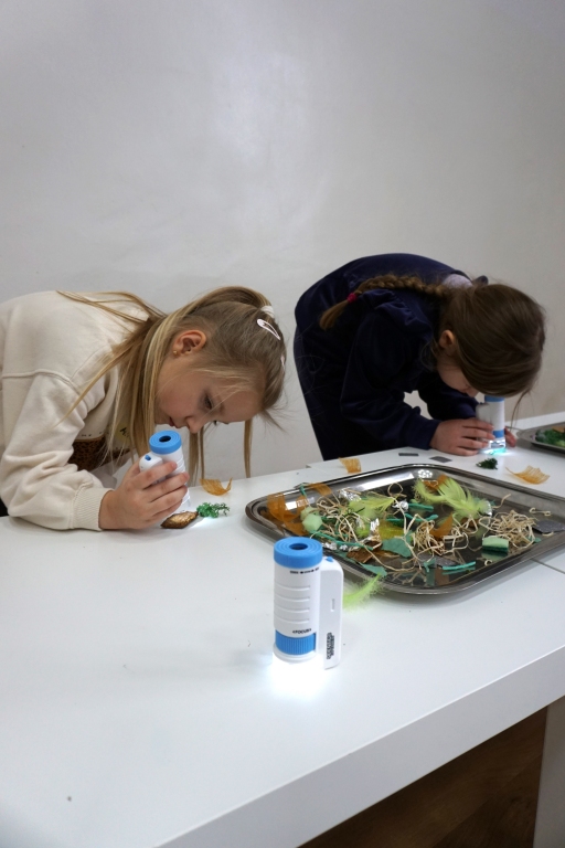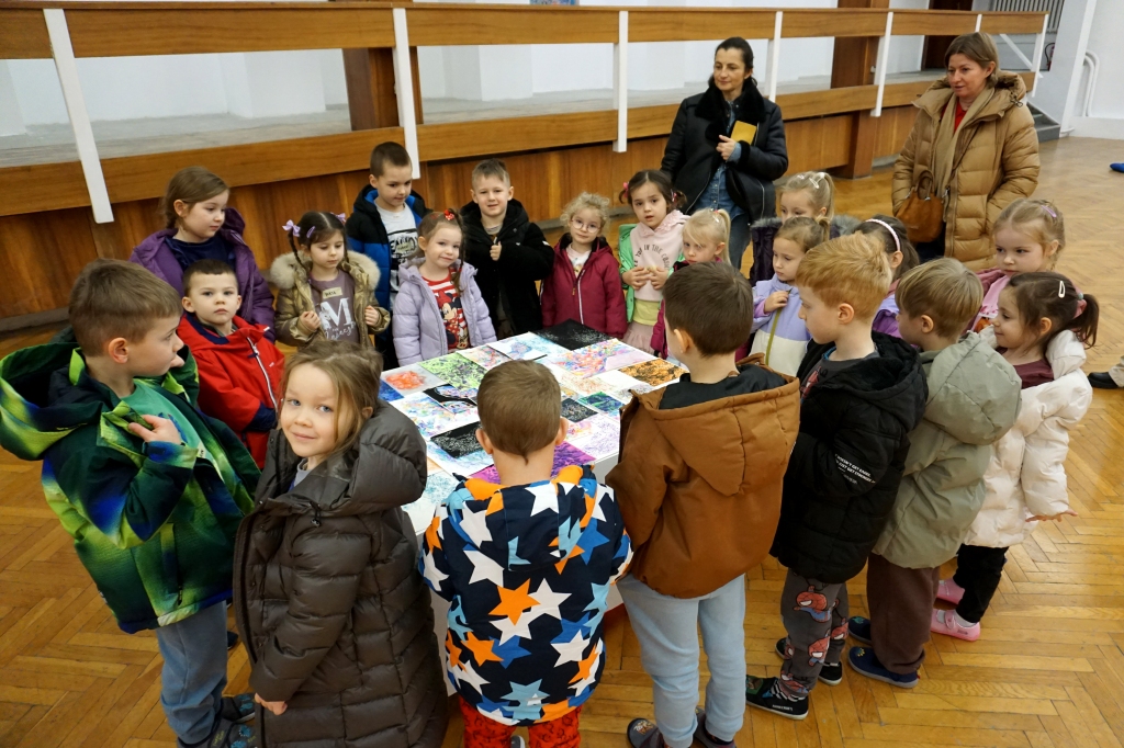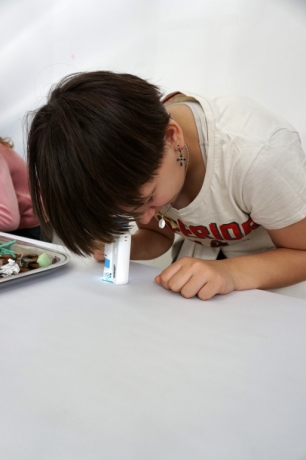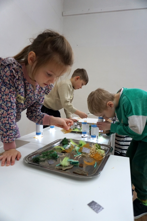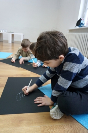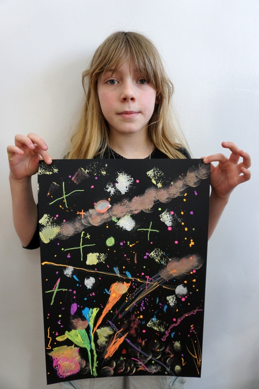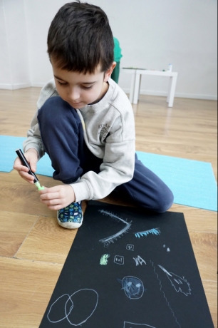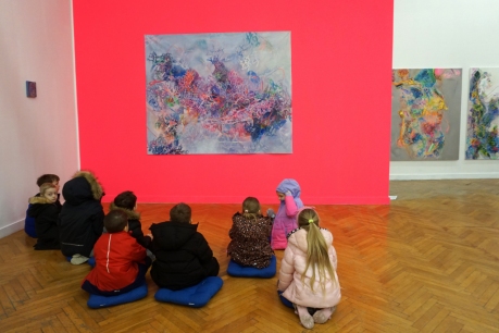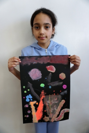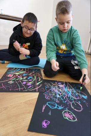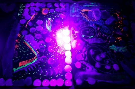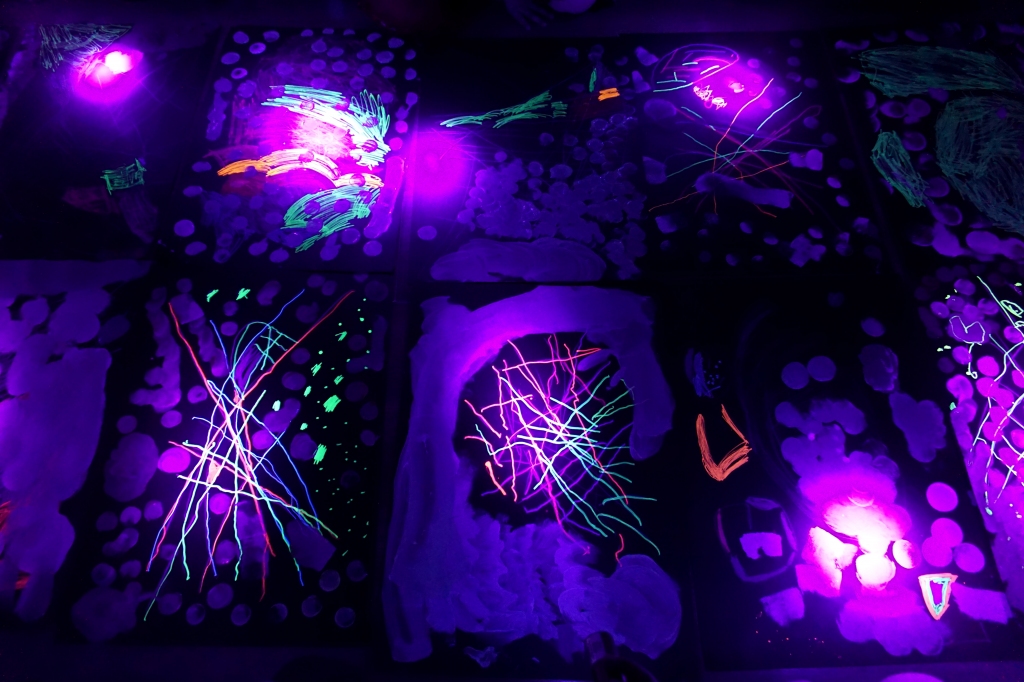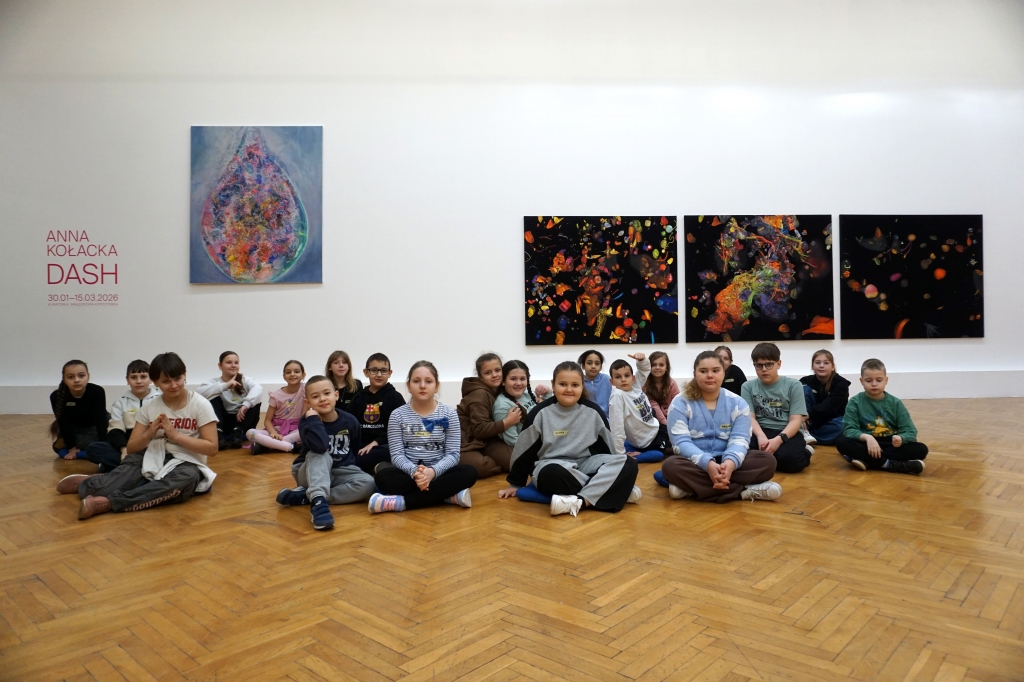 Podczas kolejnych warsztatów dzieci zwiedziły wystawę Anny Kołackiej. W części praktycznej zainspirowały się obrazami artystki i tym co zobaczyły pod mikroskopem, tworząc abstrakcyjne obrazy na czarnym tle z użyciem mazaków fluo i farb.
