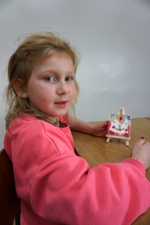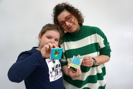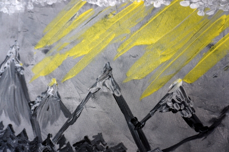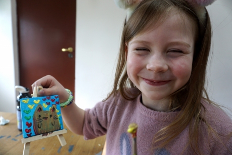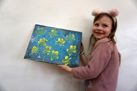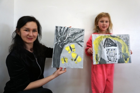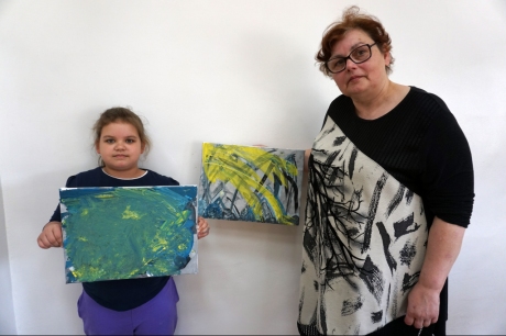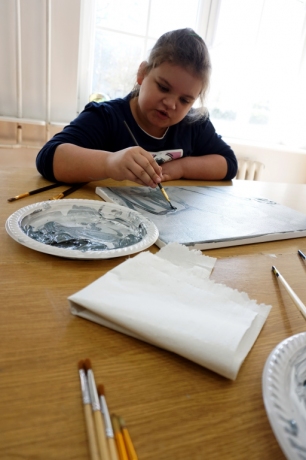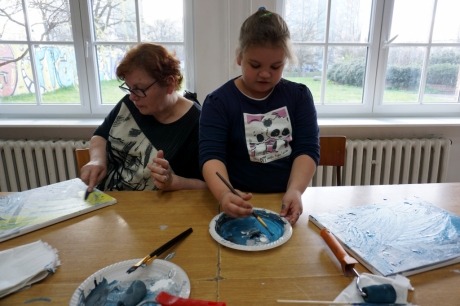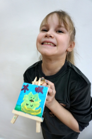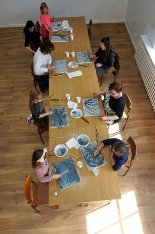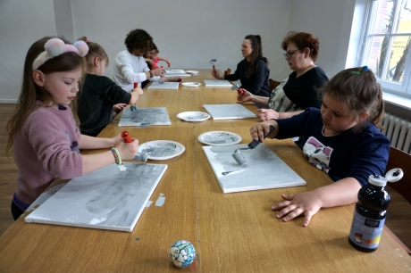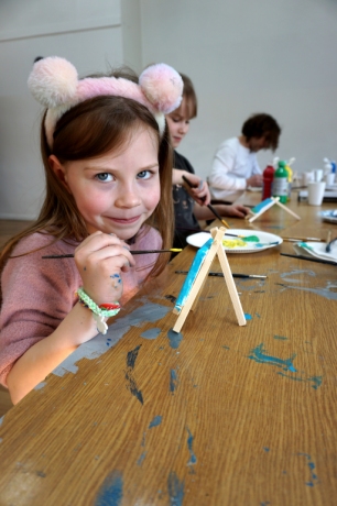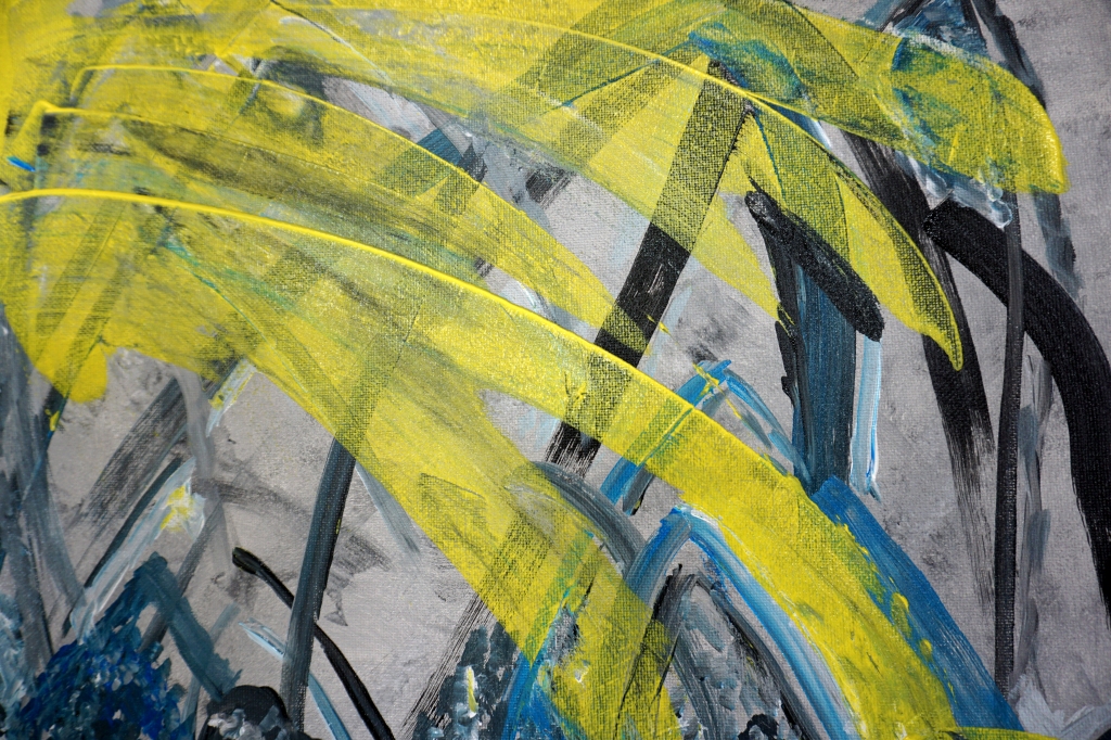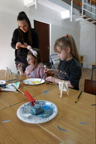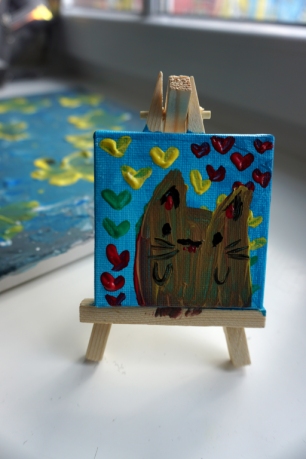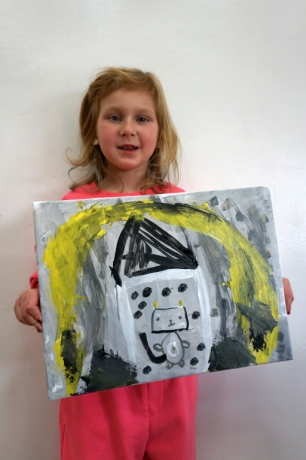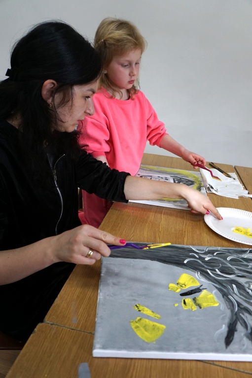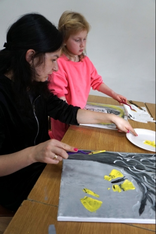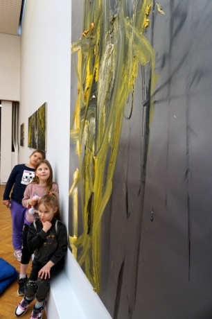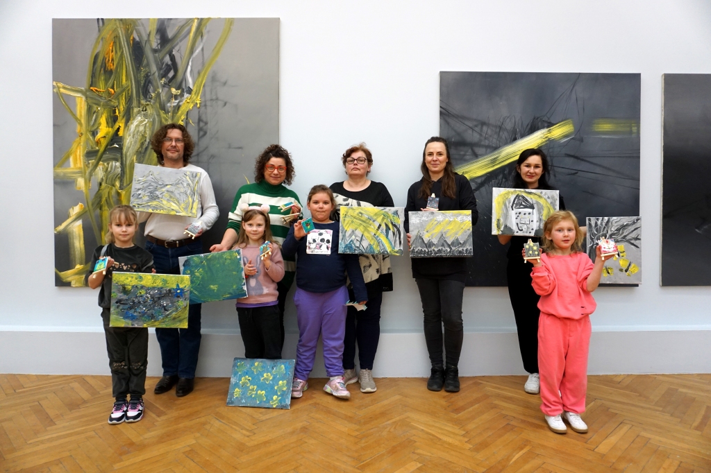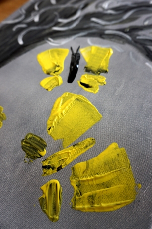 Zobaczyliśmy, że obrazy mogą być malowane ekspresyjnie i linearnie. Poznaliśmy również takie terminy, dotyczące malarstwa, jak: abstrakcja, impast, kontrast i akcent. Następnie uczestnicy stworzyli swoje obrazy na blejtramach (małych i dużych): linearne, abstrakcyjne z żółtym akcentem.