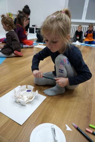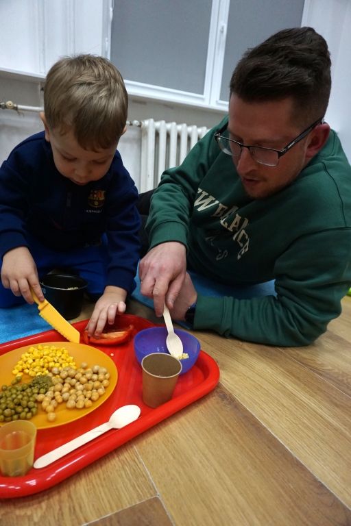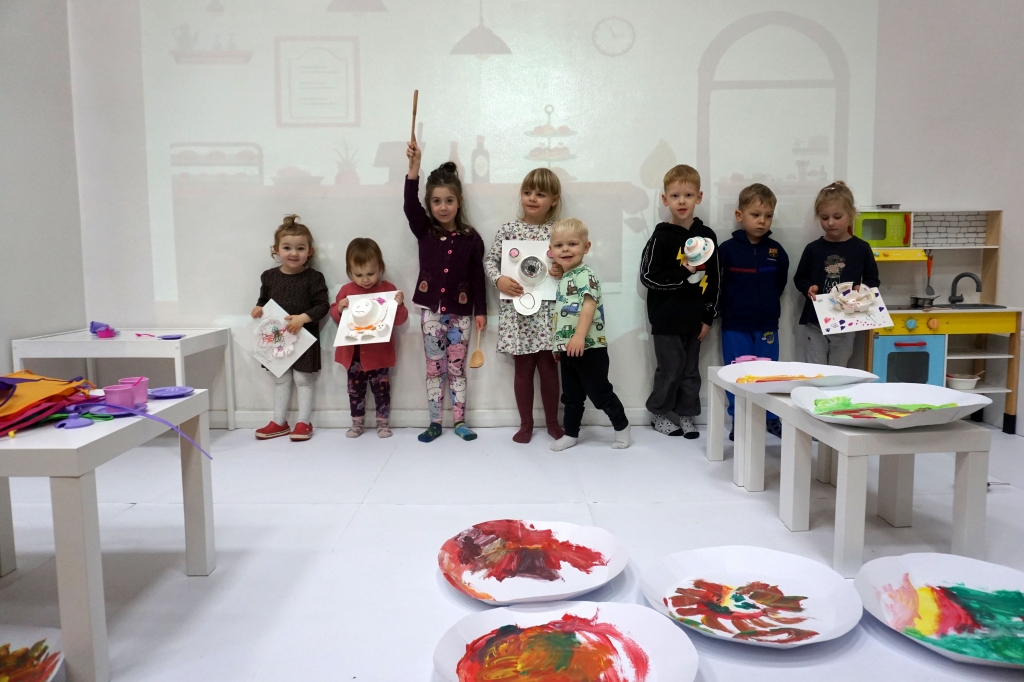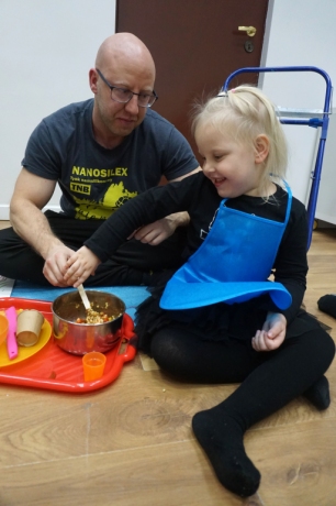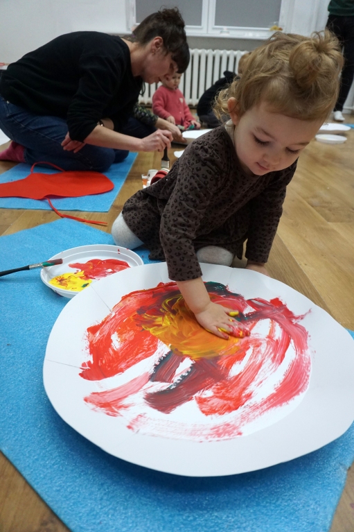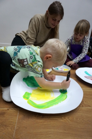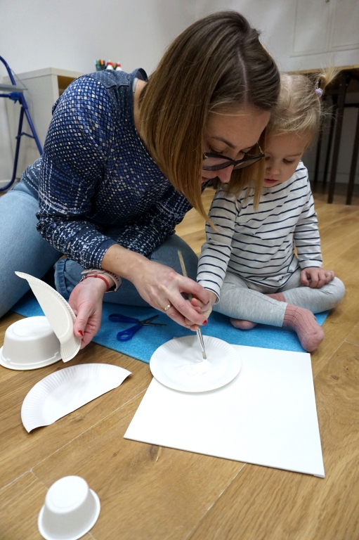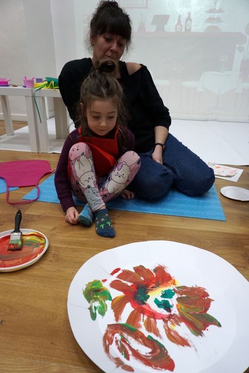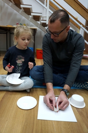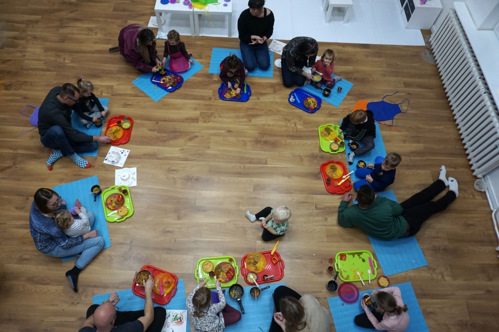 Listopadowe SZTUKowanki rodzinne warsztaty dla najmłodszych pachniały warzywami, pesto, passatą pomidorową i ziołami. Dzieci najpierw bawiły się robiąc rodzicom hebratę, kawę i gotując "na niby". Nastepnie z jednorazowych talerzy i misek stworzyły zwierzęta, owady, kwiaty. Potem 'ugotowały" swoje potrawy z prawdziwych produktów, które mogły zjeść z rodzicami. Na koniec malowały obrazy/potrawy na dużych papierowych talerzach.