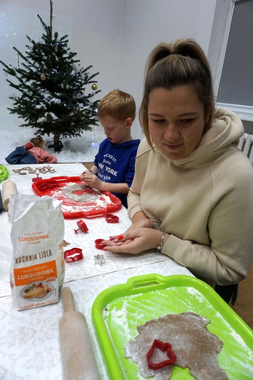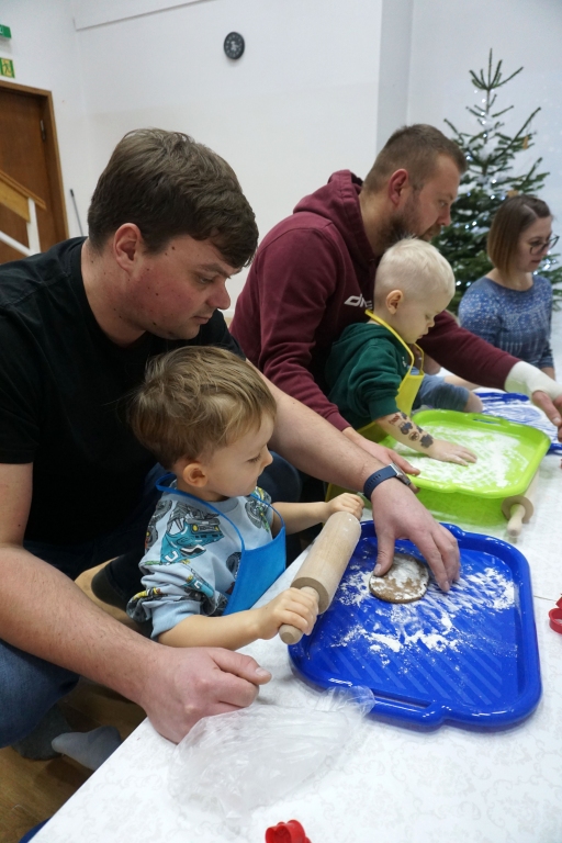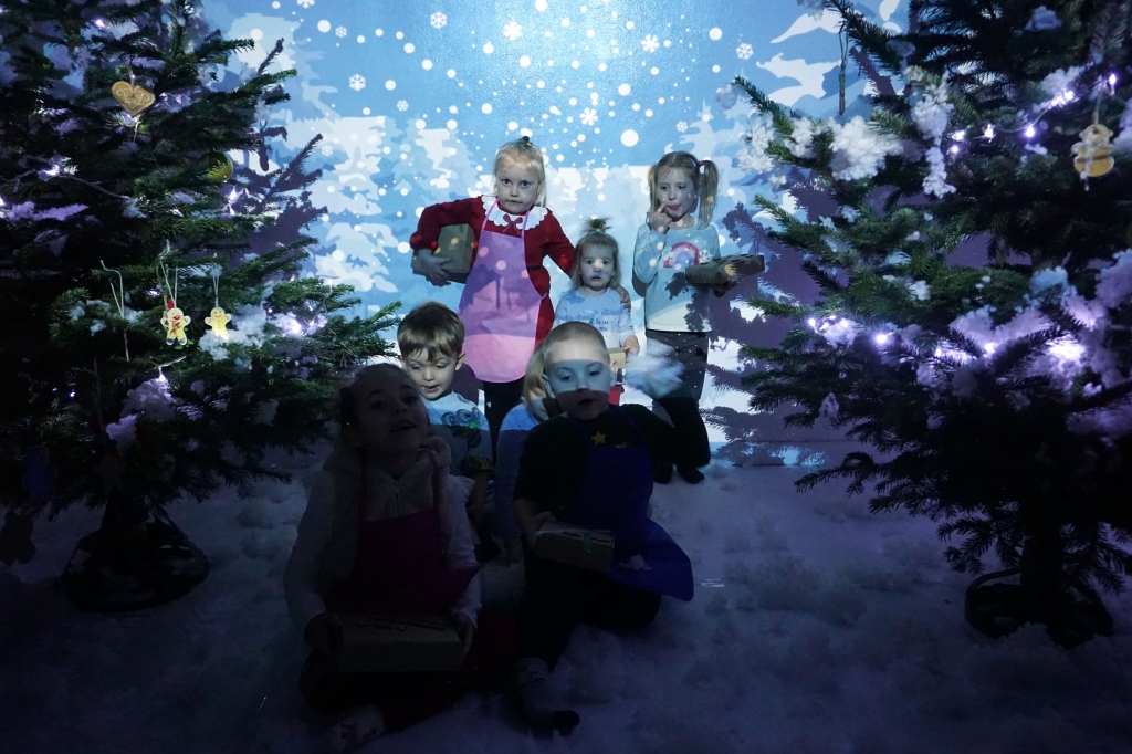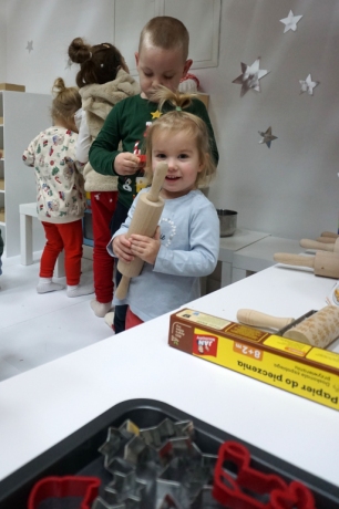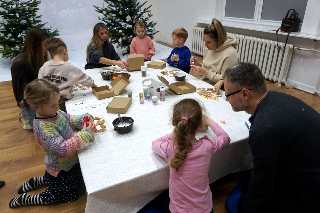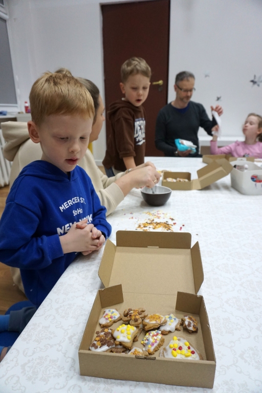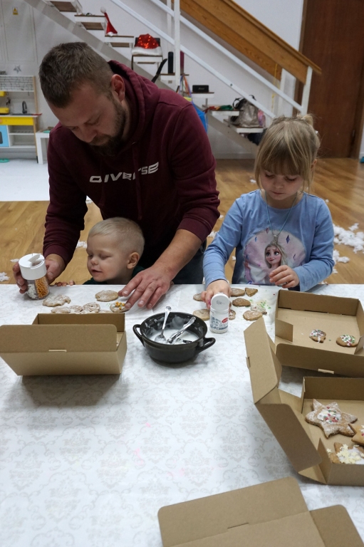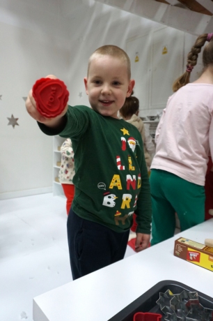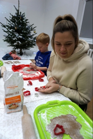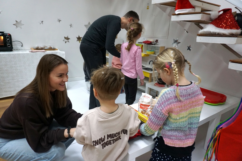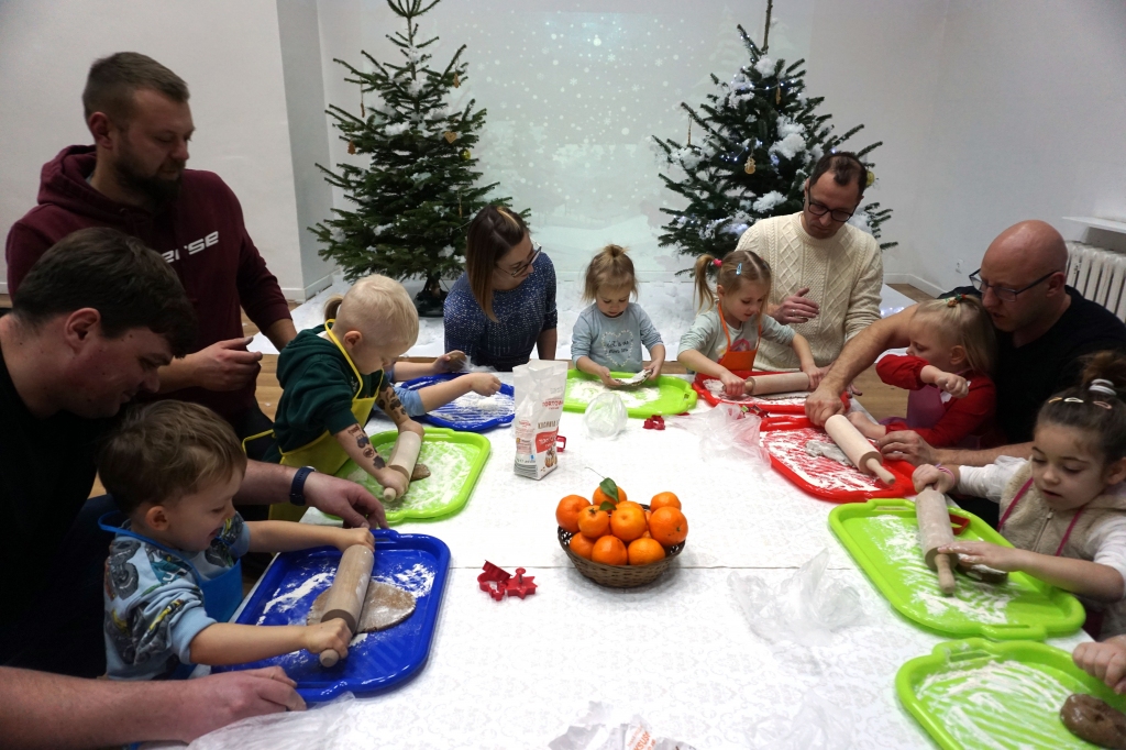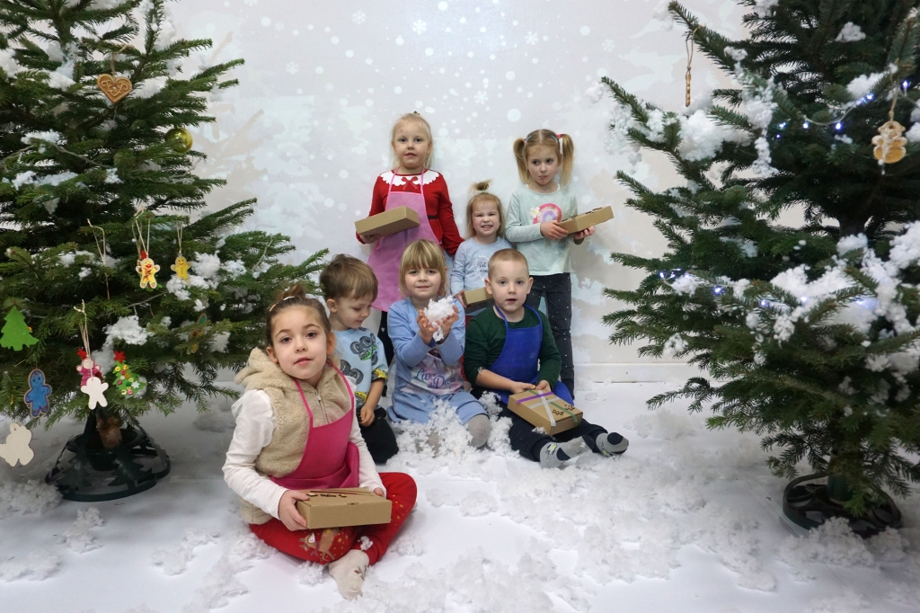 Dzieci bawiły się śniegiem z rodzicami w zimowej krainie z żywymi choinkami, następnie piekły i lukrowały pierniczki. W międzyczasie tworzyły zawieszki na choinkę. Dziękujemy za ten spokojny twórczy, rodzinny czas. Wesołych Świąt!